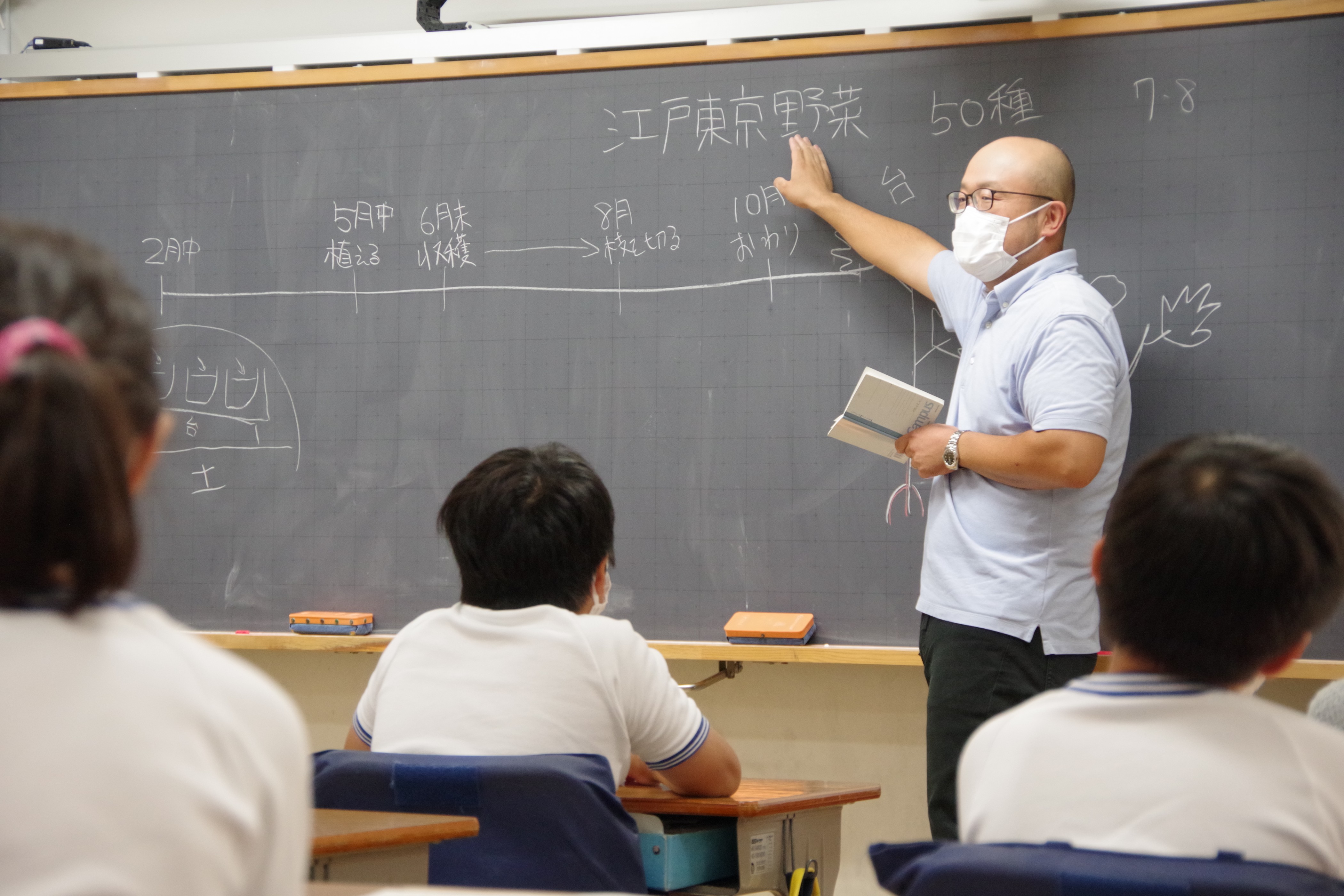豊島区立目白小学校で、9月12日に、管内の生産者が雑司ヶ谷ナスに関する理解を深める授業を行いました。