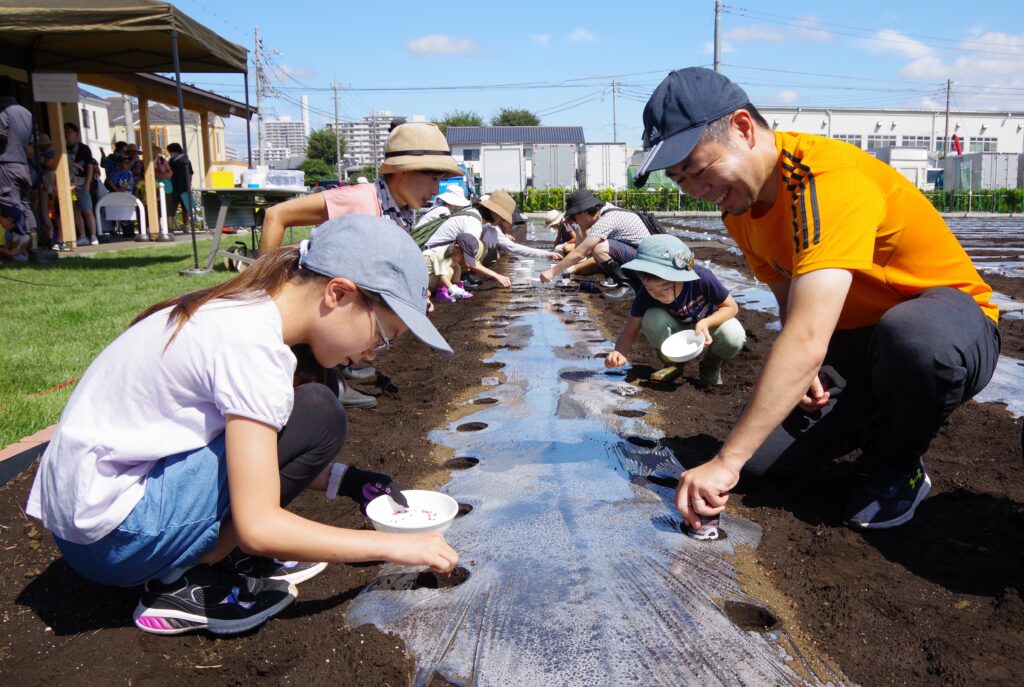 9月上旬、練馬区立高松みらいのはたけで、地元の伝統野菜「練馬大根」栽培体験コースの第1回目として種まきが行われ、親子ら37組が集まりました。参加者は、練馬大根の特徴等についてのレクチャーを受けた後、グループごとに決められた区画に種をまいたほか、希望者は園内の他区画の種まき作業もボランティアとして手伝いました。コースは全3回で構成され、10月に間引き、12月には収穫も体験できます。