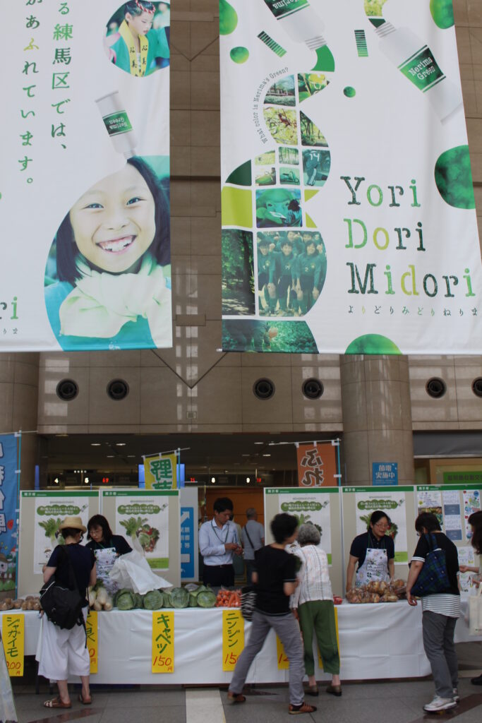 昨年選定された5色の練馬区オリジナル色の「NERIMA GREEN(ねりまグリーン)」を基調とした空間に、区内生産者が主催する地場産野菜や加工品を販売するマルシェ、キャベツの共選出荷や練馬大根引っこ抜き競技大会等の四季折々の農業の様子や練馬区の取り組みを収めたパネル約20枚が設置され、区役所を訪れた人々の目を楽しませていました。