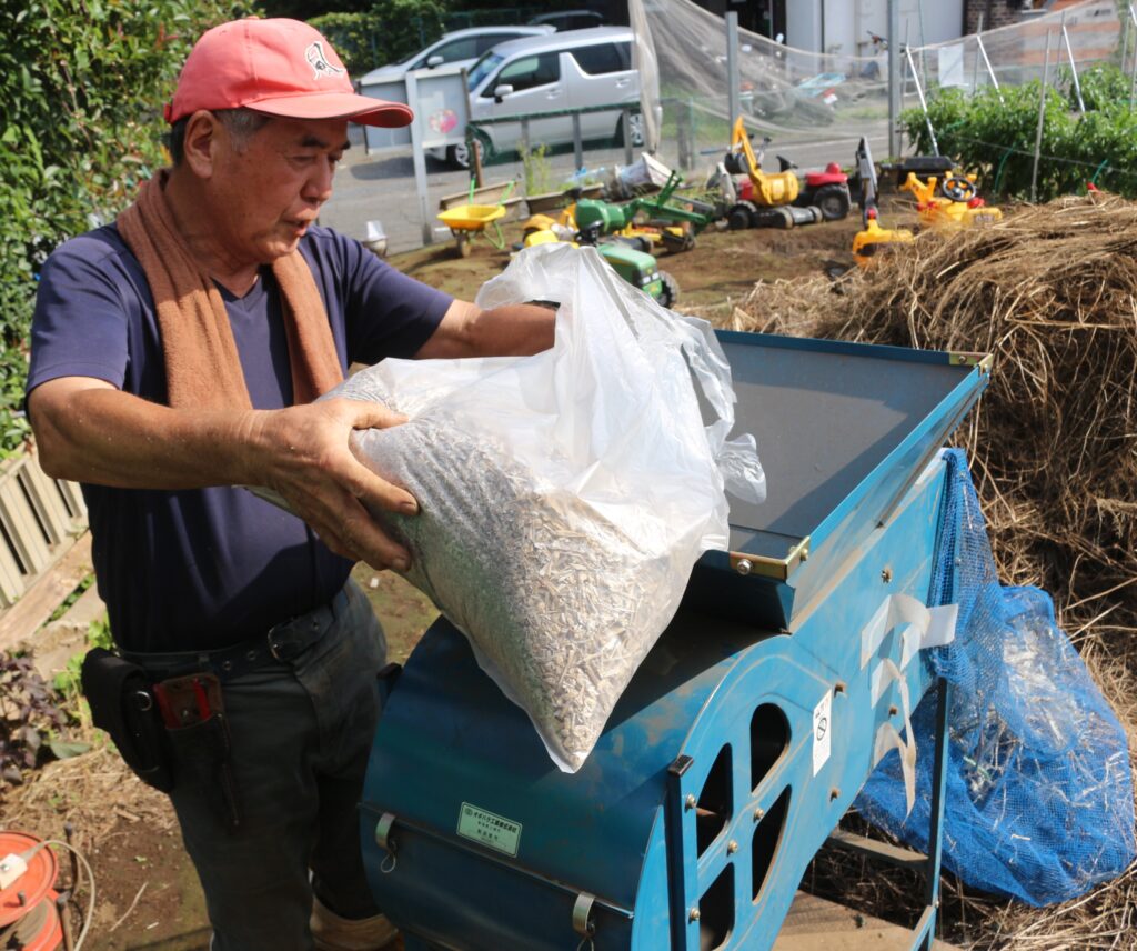 種は、練馬大根伝来種保存委託事業に参加する白石さんの畑で採ったもので、さや踏みや殻と種を分別するための唐箕(とうみ)がけなどをし、約3.8万粒が採種されました。