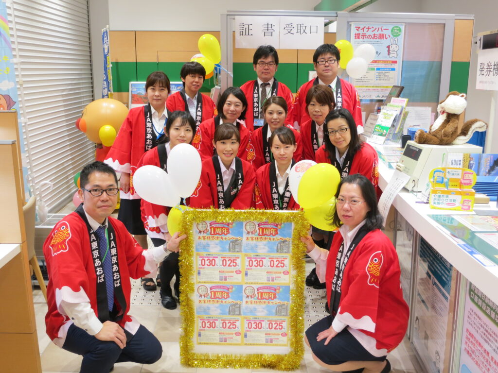 4月11日(月)と12日(火)の2日間、東大泉支店はリニューアルオープンから1周年を迎え、日頃の感謝の気持ちを込めてお客様感謝キャンペーンを行いました。キャンペーン定期貯金の取り扱いとあわせてお米のプレゼント企画も実施し、多くの来店客で賑わいました。