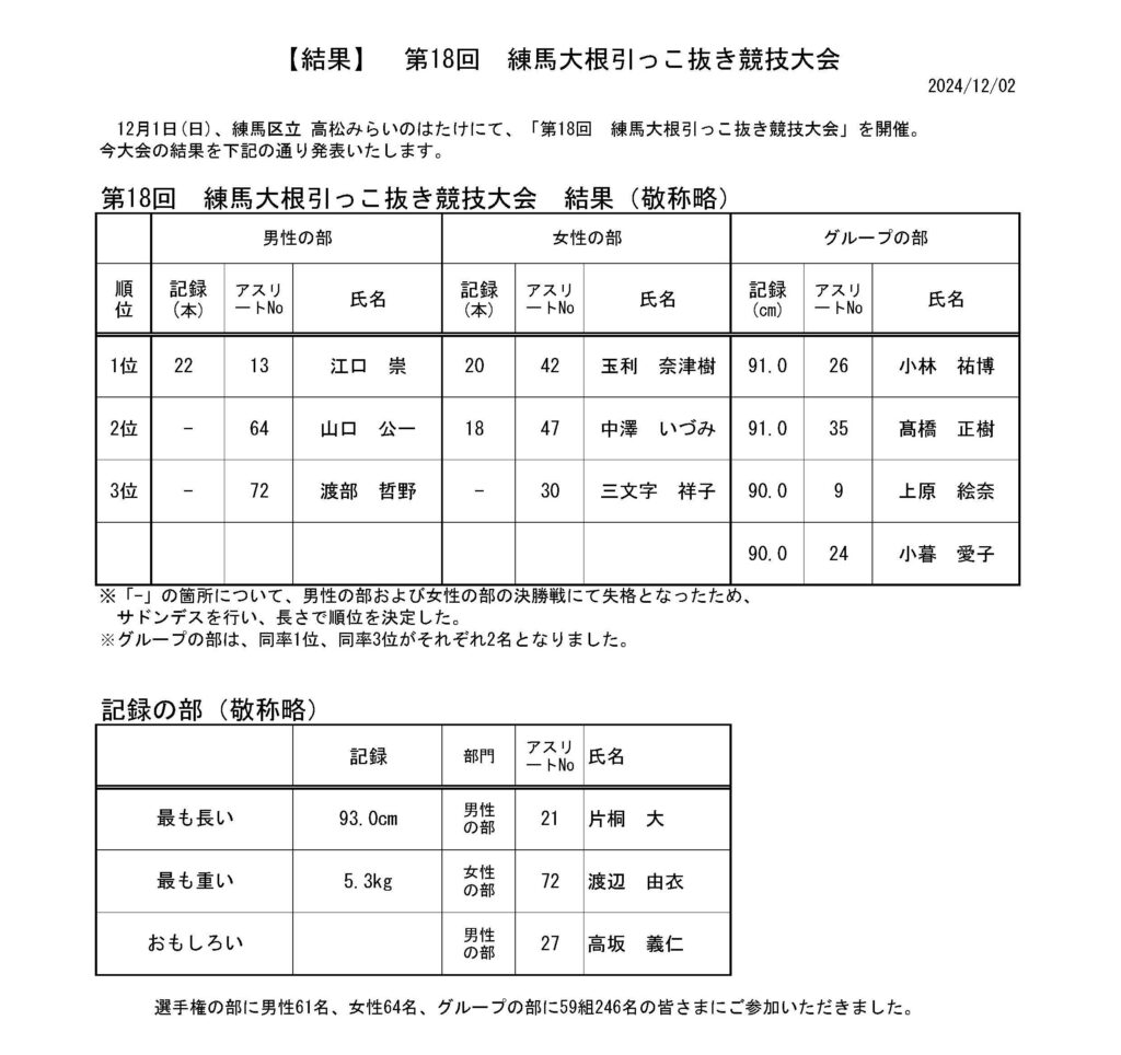 12月1日(日)練馬区高松みらいのはたけで、「第18回練馬大根引っこ抜き競技大会」を開催しました。