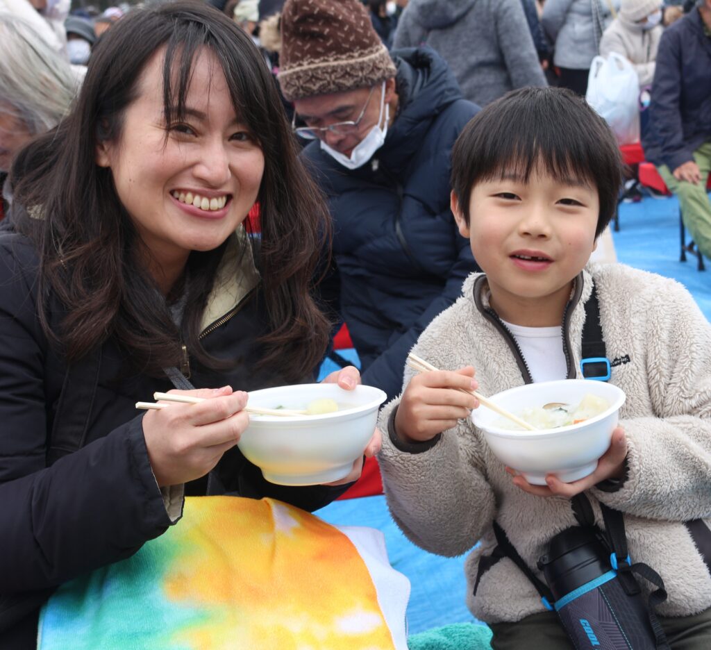 板橋ふれあい農園会と板橋区は1月7日(火)、区立城北公園で第35回新春七草がゆの集いを開きました。JA東京あおばも協力し、地域住民1000人に無料で七草がゆを振る舞いました。同農園会の会員が大釜を使って調理し、七草の他に、区内産のニンジン、サトイモ、長ネギなどたくさんの野菜を入れて炊き込みました。