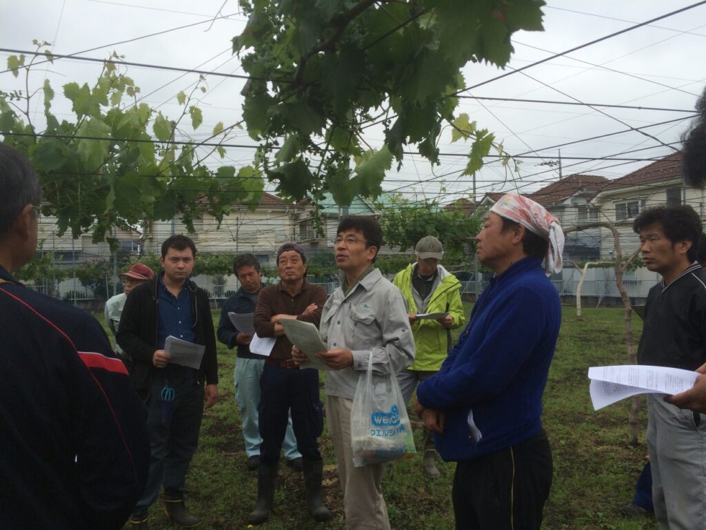 5月24日(火)、城北ぶどう研究会は、大泉地区にある組合員の圃場で芽かき講習会を行いました。東京都農業改良普及員である山岸先生を講師に招き、部会員18名が参加しました。