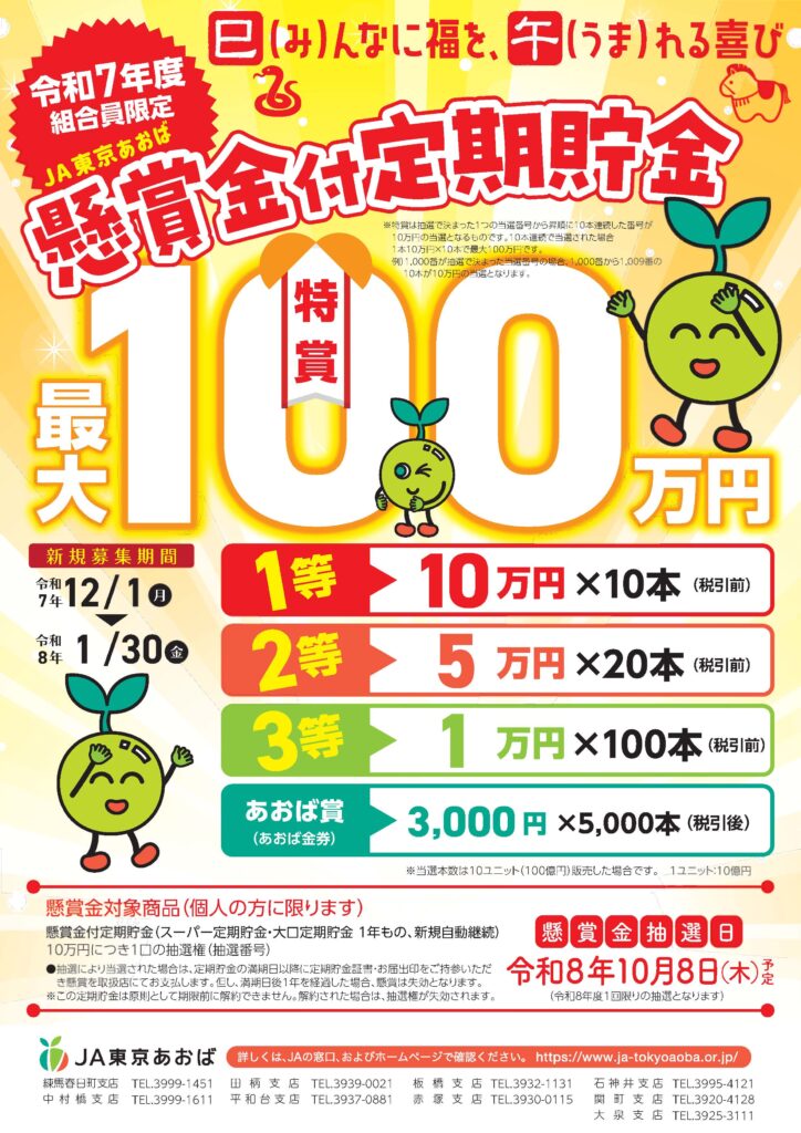 令和7年12月1日(月)から令和8年1月30日(火)にかけて懸賞品付定期貯金を募集いたします。