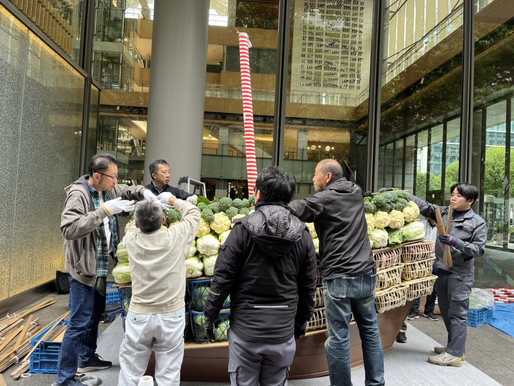 使用した新鮮な野菜は、板橋区産のダイコン、ハクサイ、ジャガイモなど。形や大きさに特別な加工を施さず、素材そのものの魅力を生かして丁寧に組み上げられました。野菜の色彩が美しく調和し、会場を訪れた多くの人々が足を止め、写真を撮る姿が見られました。
