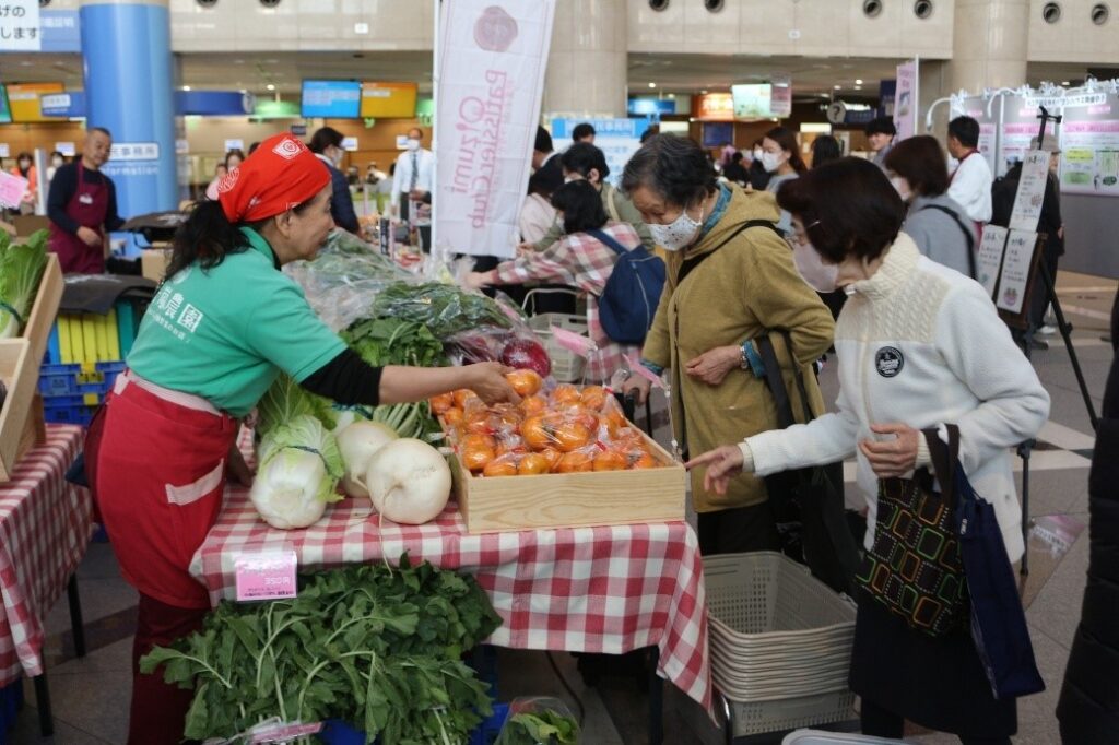 今回は、延伸地域の魅力とともに、大江戸線の延伸計画や整備効果、練馬区の今後の取り組みについて広く周知することが目的。今年度は東京都が庁内検討プロジェクトチームの検討状況を公表するなど、延伸計画が大きく前進しました。当JAも同会議のメンバーで、延伸地域の飲食店や同JA管内の生産者が農産物を出店しました。開店10時前から行列ができ、同区役所は活気にあふれていました。