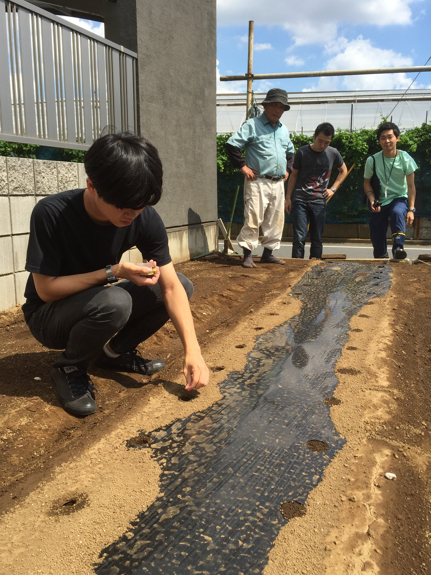 この日は、猛暑の中種まき、土かけ、寒冷紗の設置を渡戸さんの指導のもと行いました。