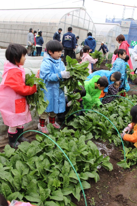 午前・午後の部合わせて2回実施し、地元の幼稚園児等40名が参加しまし、ホウレンソウ、コマツナ、ブロッコリーをそれぞれ収穫しました。
