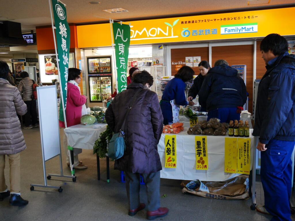 12月15日、西武池袋線練馬駅2階中央改札口前にて練馬産農産物の即売会が開催されました。緑溢れる練馬区の様々な魅力を区内外に発信していくため練馬区が2015年3月から実施している「YoriDoriMidori(よりどりみどり)練馬」プロジェクトの一環として企画され、JA東京あおばが協力しました。