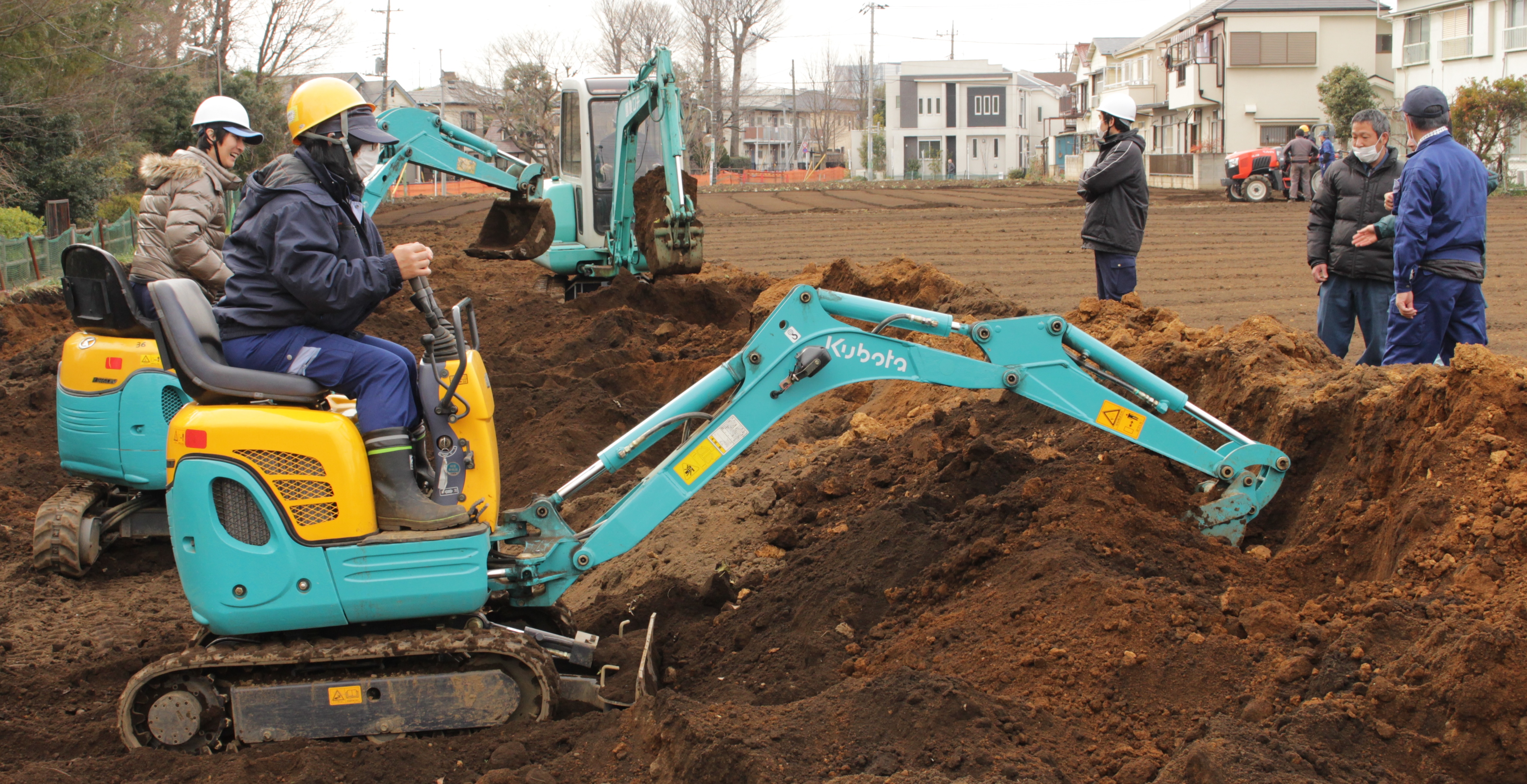 講習会は終日行われ、援農支援事業強化を目的として、ドラグショベル、トラクター、耕運機の操作説明および操作練習を実施しました。参加したJA東京あおばの若手職員は「トラクター等を実際に稼働する機会は少ないので、大変勉強になる」と、耕地の表層と深層を入れ替える天地返しを行いました。