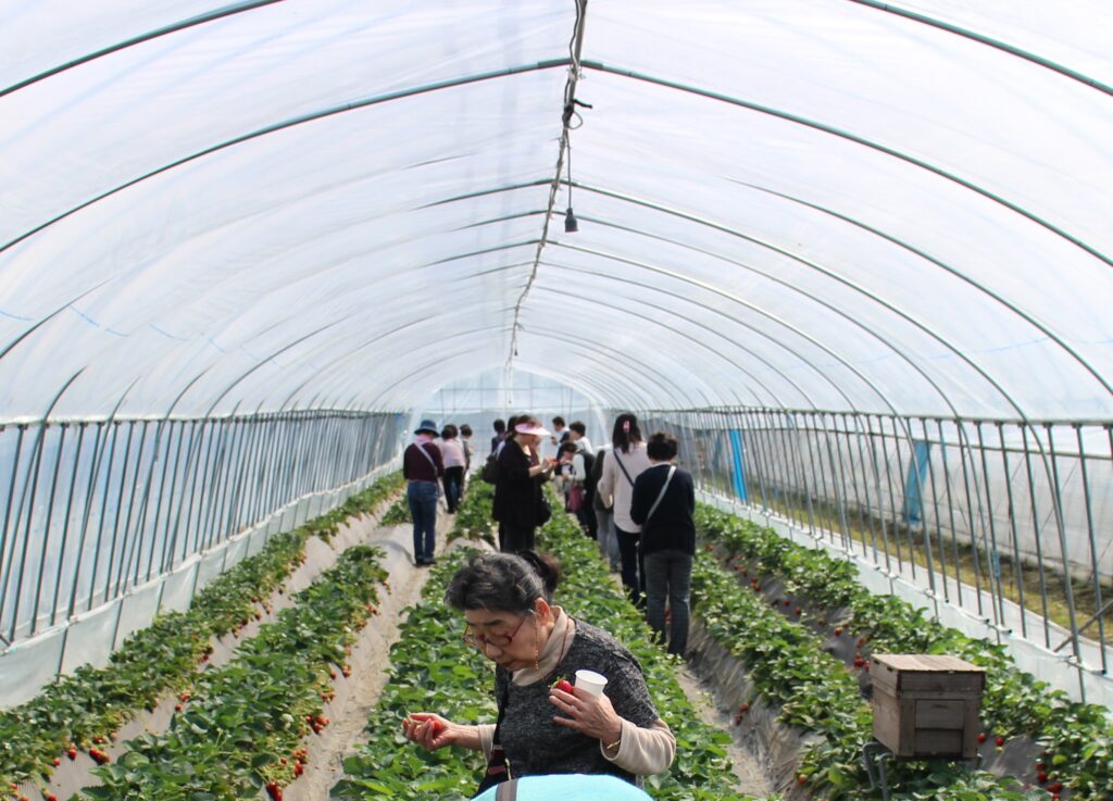 大泉地区女性部は4月12日(水)、栃木県小山市で視察研修を行いました。スカイベリーのイチゴ狩りを体験し、イチゴ農家を営む部員がみんなにおいしいイチゴの特徴を説明して盛り上がりながら、管内の育て方や味と比較しました。