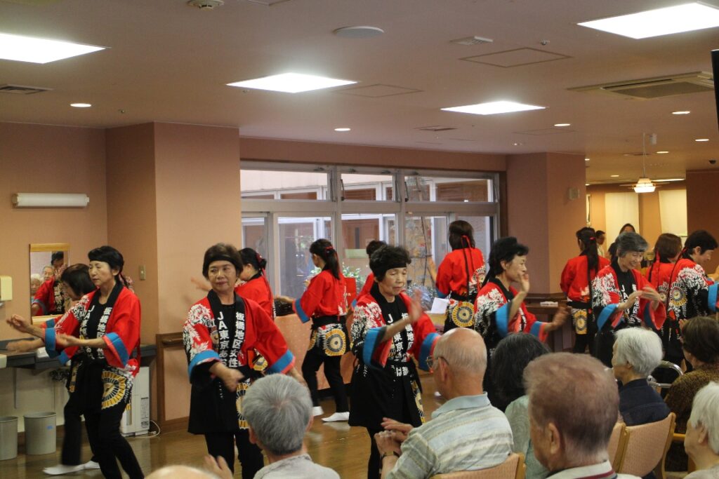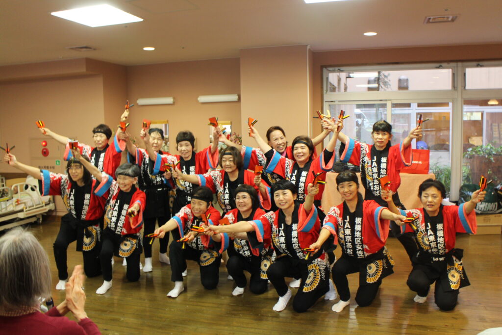 JA東京あおば板橋地区女性部「よさこい踊りの会」は、5月24日(水)、管内の老人ホームを慰問しました。例年春と秋に実施し、今回で6回目の訪問です。同会は、6年前に女性部員の健康増進や生きがいづくりを目的に発足した目的別グループで、メンバーは30人。毎月1回活動をしています。