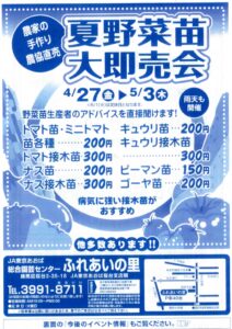 4月27日(金)~5月3日(木)ふれあいの里で「夏野菜苗大即売会」を開催いたします