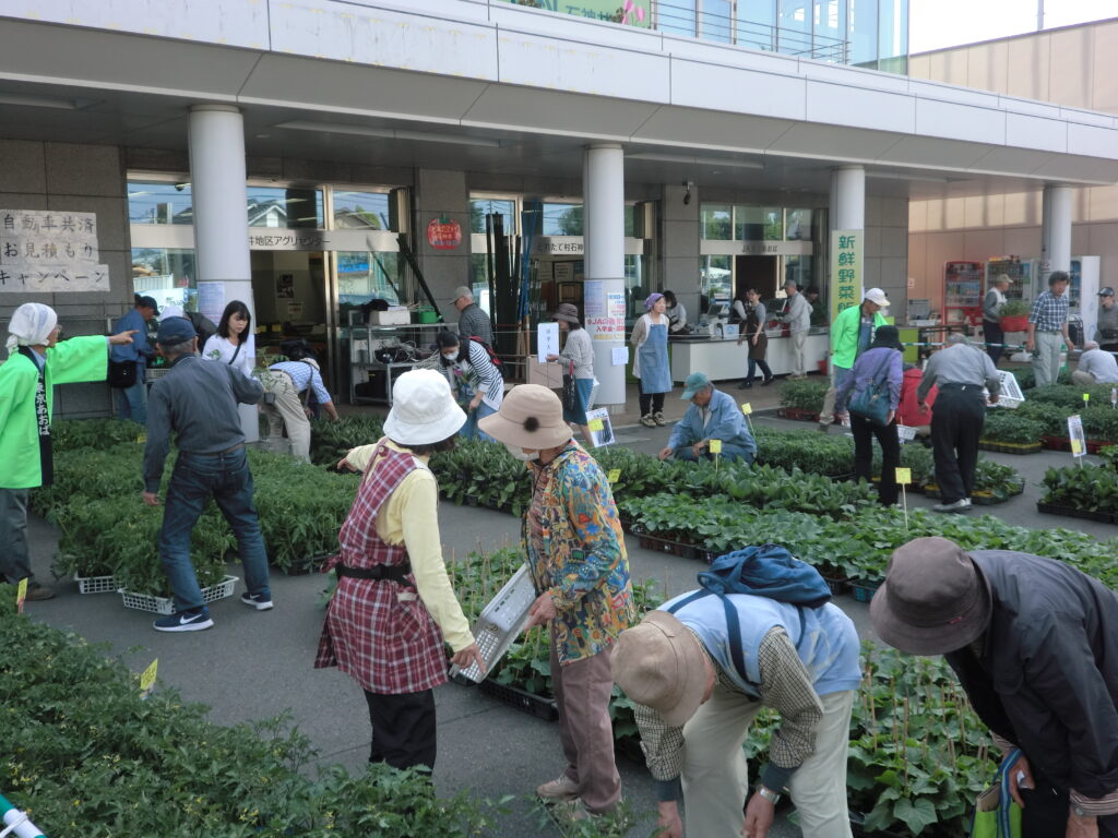 JAではこの時期に各直売所で夏野菜苗の販売をしており、とれたて村ではナス、トマト、キュウリなどの夏野菜を中心に約20種類、6,000鉢が店内と駐車場に並びました。