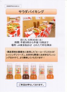今回のメニューは「サラダバイキング」の予定です。地場野菜にお好きなドレッシングをかけて、ぜひご家庭のメニューに加えてみてください!ぜひご家庭でも試してみてください。