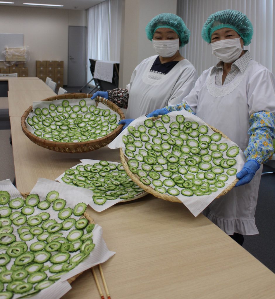 女性部員は「喜んでもらえるように」と事前に料理教室を行い、ゴーヤのチャーハン、ゴーヤチップ、ゴーヤの佃煮を振る舞いました。チップスにするゴーヤは、素揚げする前に半日乾燥させ旨味を凝縮させています。