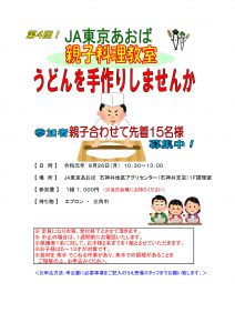8月26日(月)石神井地区アグリセンター(石神井支店)1F調理室にて親子料理教室を開催いたします。先着15組名様限定で「うどん」を一緒に手作りしてみませんか?お申し込みをお待ちしております!