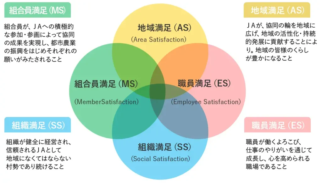 そのために、JA東京あおばは4つの満足の向上に取り組みます。4つの満足とは、組合員満足(Member Satisfaction)、組織満足(Social Satisfaction)、職員満足(Employee Satisfaction)、地域満足(Area Satisfaction)の全てが満たされ、初めて達成できるものです。