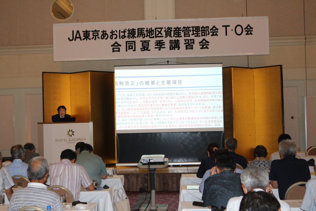 練馬地区資産管理部会は8月5日(火)、子会社である東京協同サービス株式会社オーナー会(T・O会)と合同で夏季講習会を開きました。今年度より第10次中期経営計画(農業振興計画含む)を実践しており、これらの勉強会は「組織基盤の活性化」に該当。当JAの顧問税理士よる「令和7年度税制改正ポイント」をわかりやすく、会員に説明しました。