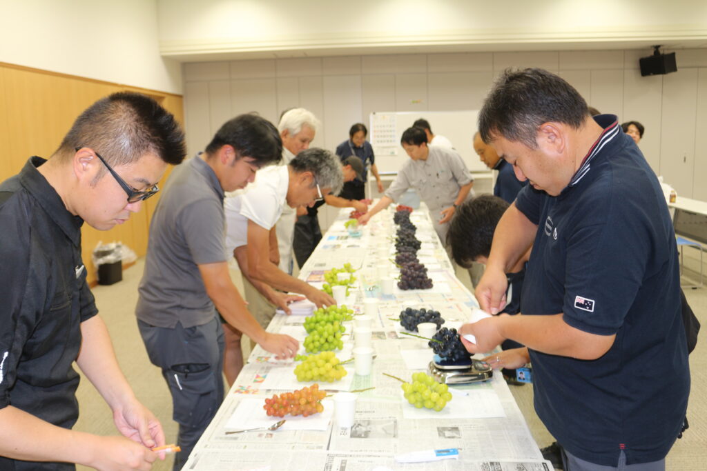 城北ぶどう研究会は8月19日(火)、練馬春日町支店で食味検討会を実施しました。練馬区でブドウを栽培する10名の生産者が「高尾」「藤稔」「シャインマスカット」など14品種28点を持ち寄りました。重量や糖度、色合いなど5項目に基づき測定し、試食して違いを比べました。