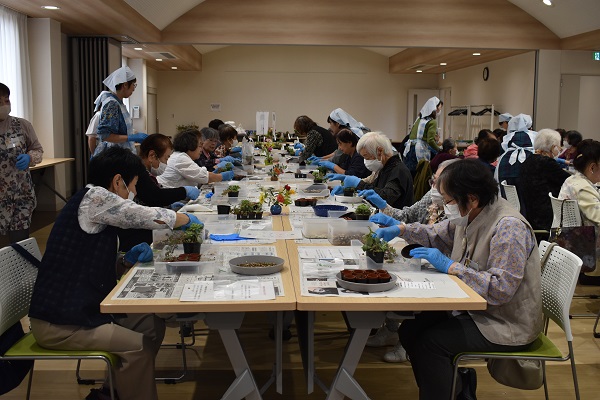 当日は多肉植物の寄せ植え講習会を行い、昼食には会員や女性部役員によるすずしろ汁や田舎まんじゅうを作りもてなしました。その後のカラオケ大会では皆さんの元気な歌声を披露し、ビンゴゲームなども、大いに盛り上がりをみせました。