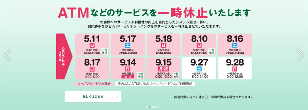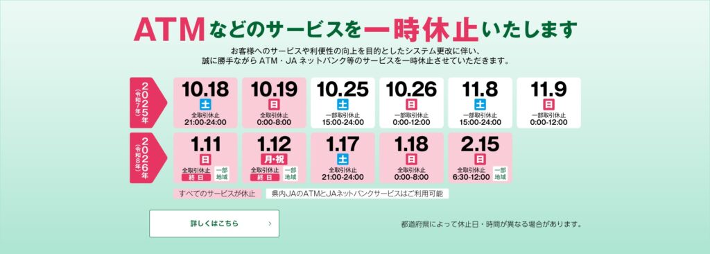 なお、キャッシュカードをご利用の場合には、全国のJAのATM・CDで、終日無料で出し入れができます。